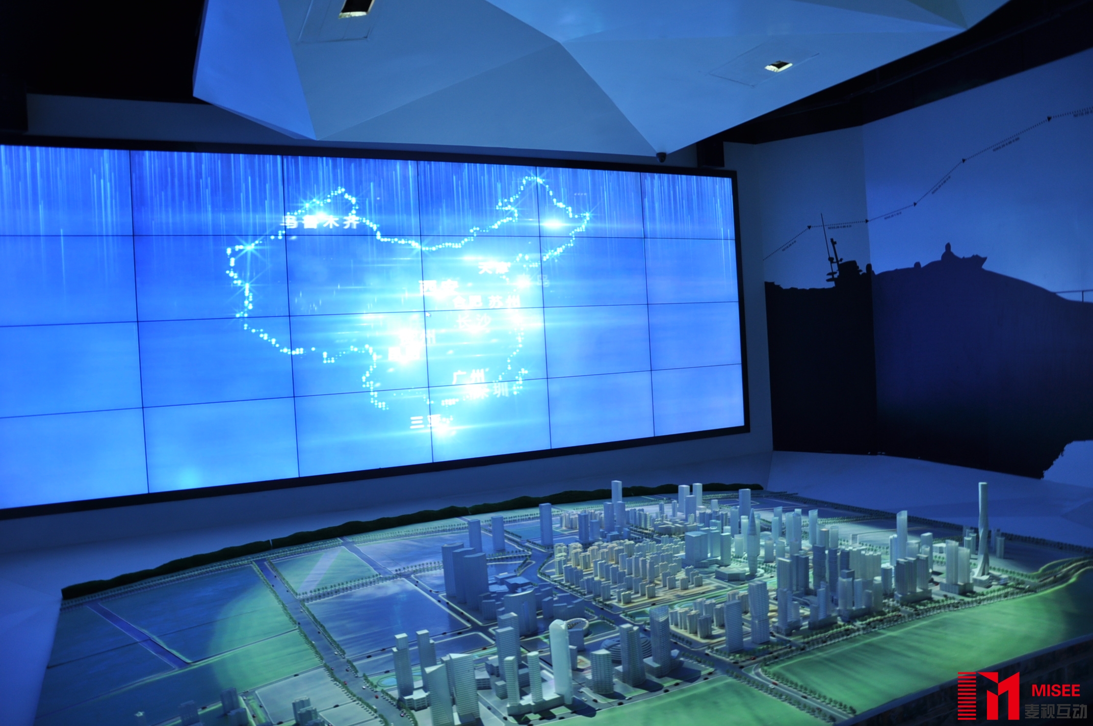 以多媒体影像沙盘展示为基础,增加触摸显示系统、投影系统、互动控制系统,实现规划场馆成果展示, 三维模拟地形及交通服务管理,是面向开发规划管理与民生服务的智慧城市解决方案。